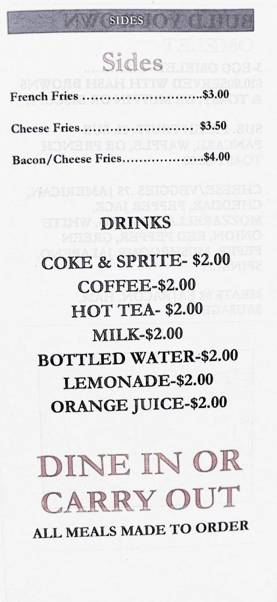 Two eggs; Choice of 1 meat: Sausage, Bacon, Ham, Polish, Porch Chop, or 3 Wings; Choice of 1 Side: Hash Browns, Breakfast Potatoes, Grits, or Rice, Served w/Toast, Muffin or Biscuit.